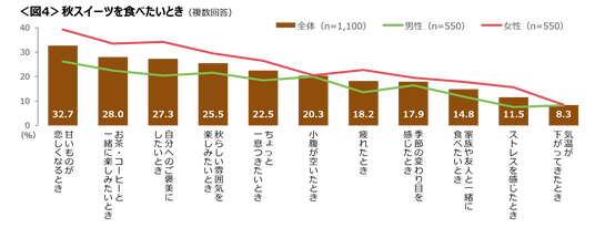 秋スイーツを食べたいときは、「甘いものが恋しくなるとき」「お茶・コーヒーと一緒に楽しみたいとき」「自分へのご褒美にしたいとき」がTOP3。