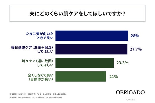 近年、男性の美容意識が高まり、男性向け美容市場も拡大していますが、「美肌にしたい」という願望がありながらスキンケアを習慣化できていない男性も多いのが現状です。そこで男性向け化粧品「OBRIGADO」を製造・販売する株式会社ビエスト化粧品は、「夫の肌ケアに対する女性の意識調査」を実施しました。