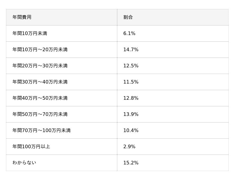 実際に支払った年間費用を分析すると、「30万円未満」(33.3%)、「30万円~50万円」(24.3%)、「50万円以上」(27.2%)の3つの層がそれぞれ一定の割合を占め、明確な「相場」が存在しない「三極化」の様相を呈しています。