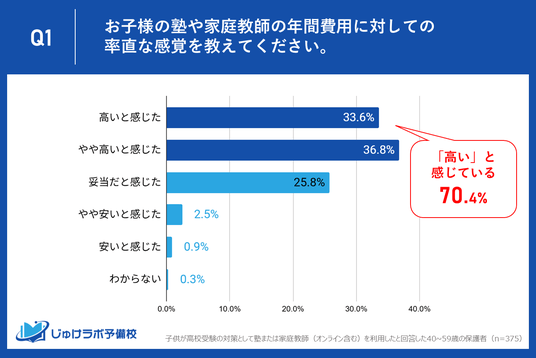 今回の調査で、お子様の塾や家庭教師の年間費用に対する率直な感覚を尋ねたところ、「高いと感じた」(33.6%)と「やや高いと感じた」(36.8%)を合わせると、実に70.4%もの保護者が費用を負担に感じていることが明らかになりました。