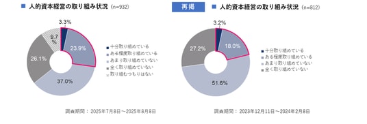 人的資本経営の取り組み状況に関する調査では、「十分取り組めている」が3.3%、「ある程度取り組めている」が23.9%で、合計 27.2%の企業がすでに取り組んでいた。2023年度の調査結果と比較すると、「十分取り組めている」は3.2%から3.3%へとほぼ横ばいである一方、「ある程度取り組めている」は18.0%から23.9%へと増加している。この結果は、人的資本経営を認知する企業が増えたことにより、実際に行動に移す企業も増加していることを示している。すでに人的資本経営に取り組んでいる企業は、成果指標や運用体制を整え、さらなる成果につなげるべきである。また、まだ取り組んでいない企業も、できることから少しずつ取り組みを始めることが重要だ。