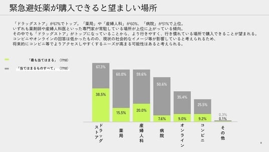 「ドラッグストア」が最も多く(67%)、次いで薬局(60%)、産婦人科(60%)が続きました。