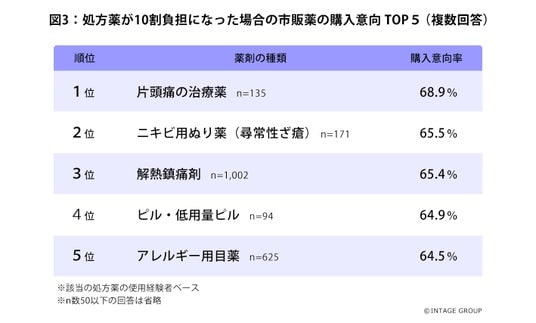 次に、処方薬が保険適用外(自己負担額10割)になったと仮定し、該当の処方薬の使用経験がある人を対象に、その薬剤の市販薬の購入意向を確認しました。その結果「片頭痛の治療薬(68.9%)」「ニキビ用ぬり薬(尋常性ざ瘡)(65.5%)」「解熱鎮痛剤(65.4%)」「ピル・低用量ピル(64.9%)」「アレルギー用目薬(64.5%)」が高い結果となりました。(図3)「片頭痛の治療薬」や「ピル・低用量ピル」など、現時点で市販薬として販売されていない薬剤であっても、実際に処方薬を使用したことがある人のうち一定数は、市販薬として買いたいと考えていることが明らかになりました。