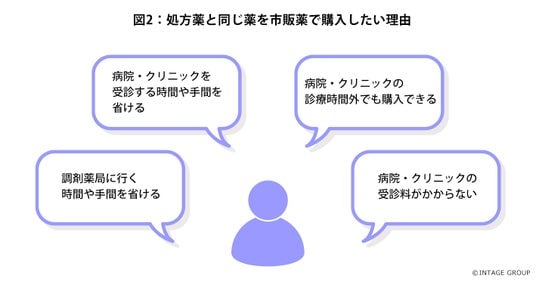 これらの薬剤を市販薬で購入したい理由は、「病院・クリニックを受診する時間や手間を省ける」「病院・クリニックの診療時間外でも購入できる」「病院・クリニックの受診料がかからない」など利便性や経済的メリットが多く挙げられました。(図2)特に、現時点で市販薬が販売されていない「インフルエンザの治療薬」が上位となった背景としては、体調が悪い中病院で長時間拘束されたくない、診療時間外でも入手したいなど、生活者のニーズが顕在化したものと考えられます。