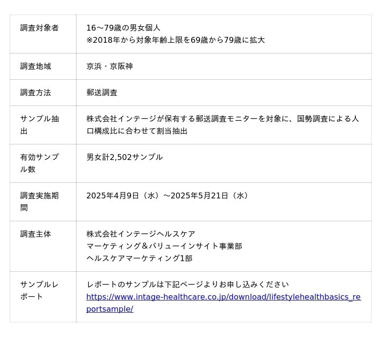 「生活健康基礎調査」は、生活者の健康状態・健康意識、市販薬の使用実態を捉え、市販薬と生活者との関わりに関する経年データを整備することを目的としたもので、本年で35回目となります。なお、このリリースは本調査の中から、調査結果を抜粋して作成しています。