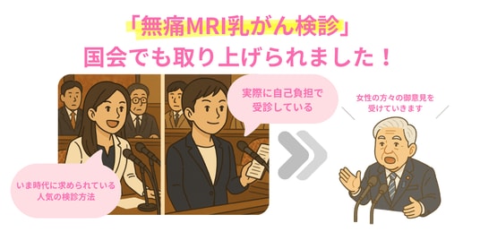 さらに翌6月には、立憲民主党の塩村あやか参議院議員が、MRIドゥイブス法を「時代に求められている検診方法」として取り上げ、痛みのない乳がん検診の普及を国として支援するよう提案しました。これに対し石破総理は、「乳がん検診の受診率向上については、急いで取り掛かりたい」といった主旨の発言をされ、今後も女性の声を積極的に取り入れていきたいと答弁しました。
