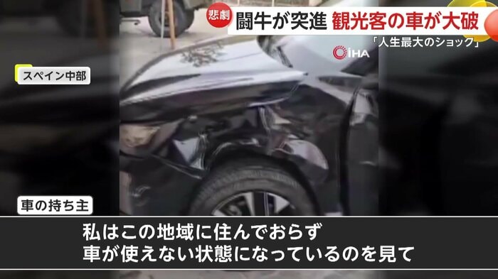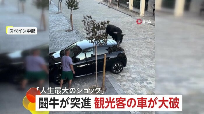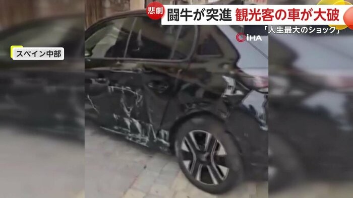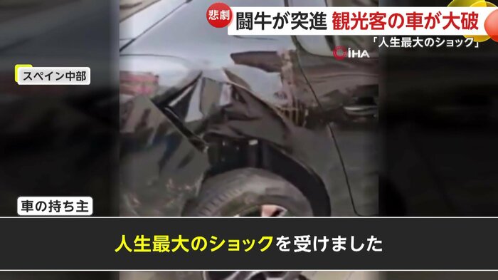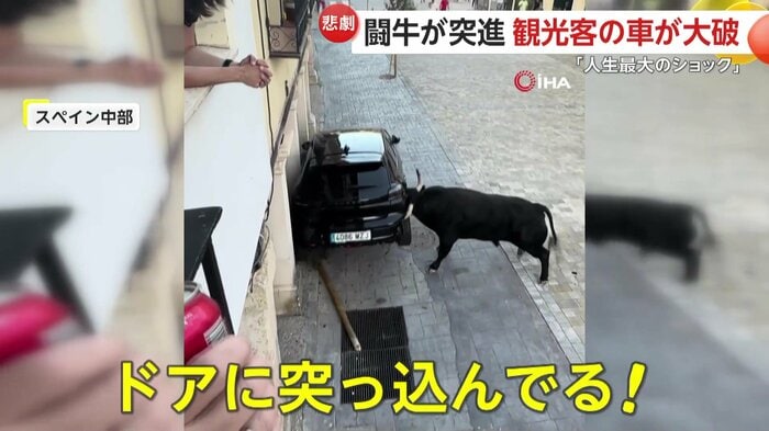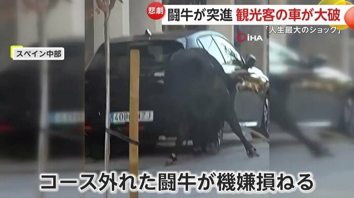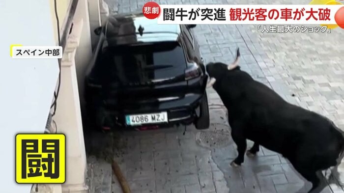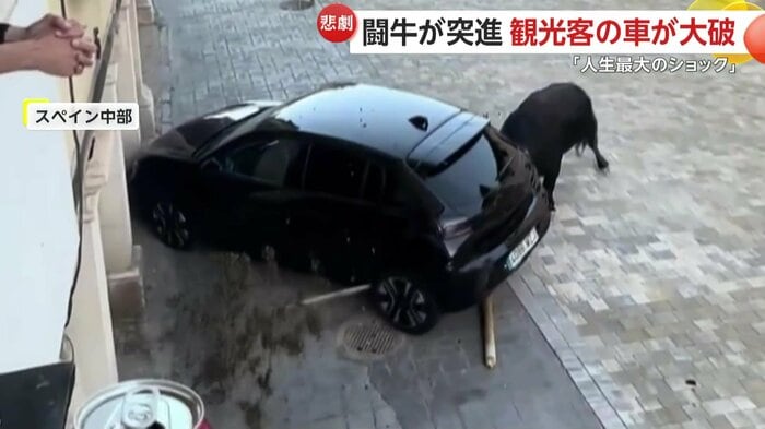 闘牛が機嫌損ね…その場にあった車が矛先に