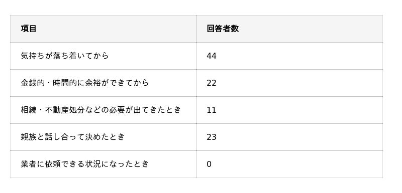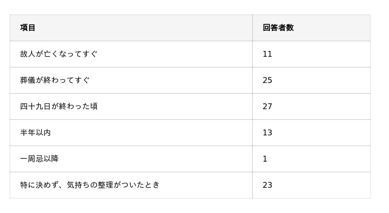 遺品整理を行うタイミングとして、適切だと思う時期はいつですか?