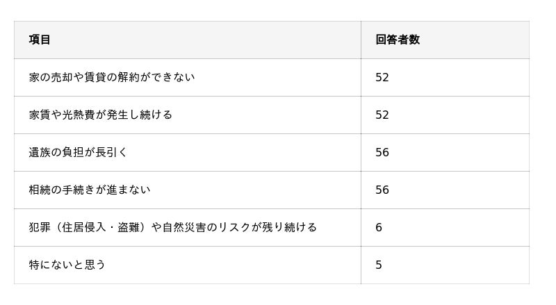 ・遺品整理のタイミングが遅れることで、「物件の売却・解約」「家賃・光熱費の発生」「遺族負担の長期化」「相続手続きの遅れ」が懸念される。