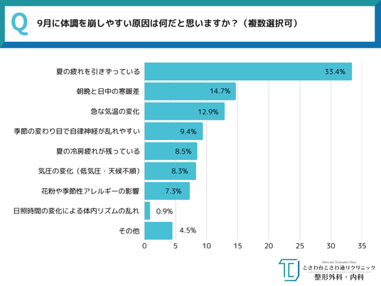 TOP3:1. 夏の疲れを引きずっている 33.4% 2. 朝晩と日中の寒暖差 14.7% 3. 急な気温の変化 12.9%