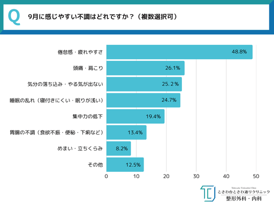 この結果は、9月病が単なる「気分の問題」ではなく、身体的な疲労や自律神経の乱れと密接に関わっていることを示しています。特に働き盛り世代にとっては、仕事の生産性低下や日常生活への支障にも直結する重要なサインと考えられます。