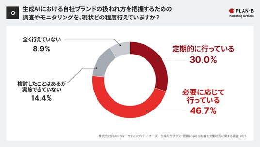 「生成AIにおける自社ブランドの扱われ方を把握するための調査やモニタリングを、現状どの程度行えていますか?」という質問では、「定期的に行っている」30.0%、「必要に応じて行っている」46.7%と、合計76.7%が実施していると回答しました。