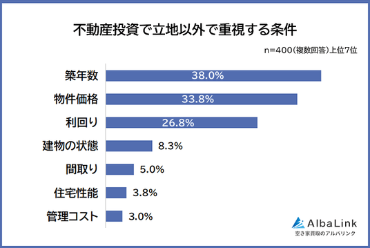 今回、株式会社AlbaLink( https://albalink.co.jp/ )が運営する不動産投資の森( https://2do-3.com/ )は、不動産投資に関心がある400人を対象に「不動産投資で重視する立地条件」についてアンケート調査を実施しました。