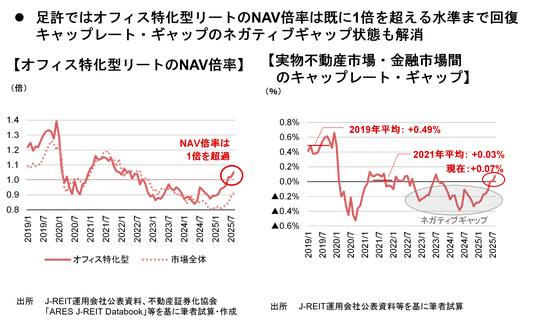 - 足許ではオフィス特化型リートのNAV倍率は既に1倍を超える水準まで回復。