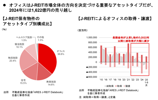 - J-REITの保有するオフィスは、2024年には1,622億円の売り越しとなった。
