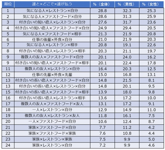 「あなたは以下のシチュエーションで外食をする際、自分でクーポンを使うこと、もしくは同行者がクーポンを使うことが恥ずかしい/かっこ悪いと感じますか?」という質問で、「とてもそう思う」「そう思う」を選んだ割合が最も多かったのが「気になる人」と「レストラン」で「自分が払うとき」の28.8%でした。その他の上位も「誰と」部分は「気になる人」「付き合いの短い恋人」がTOP5を占め、一方で「家族」はいずれのシチュエーションも「恥ずかしい/かっこ悪い」と感じる人が少なく、「一人」での外食時よりも少ない結果になりました。