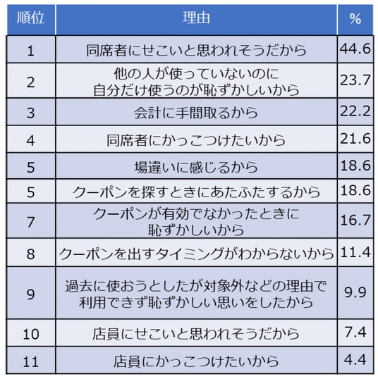 ■クーポン利用が恥ずかしい理由は「同席者にせこいと思われそうだから」が44.6%で一位