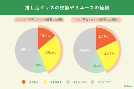 「フリマアプリでグッズを売買したことがありますか?」という問いに対し、「よくある」(14.0%)と「たまにある」(29.4%)の合計が43.4%に上りました。また、「ランダムグッズなどをSNSや現場でファン同士で譲ったり交換したりしたことがありますか?」という問いには、「よくある」(17.9%)と「たまにある」(25.1%)の合計が43.0%となりました。