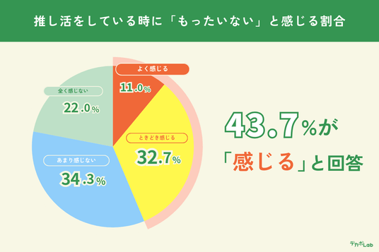 推し活をしているZ世代に「もったいない」と感じるか尋ねたところ、「よく感じる」(11.1%)、「ときどき感じる」(32.6%)を合わせ、43.7%が何らかの形で「もったいない」という感情を抱いた経験があることが判明しました。