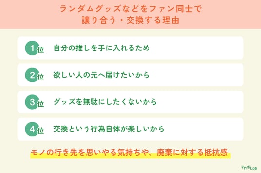 「ランダムグッズなどをSNSや現場でファン同士で譲ったり交換したりする理由」について尋ねたところ、以下の結果となりました。