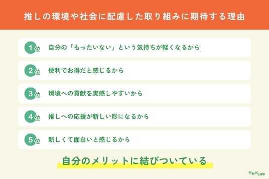 「もし推しが環境や社会に配慮した取り組みを行う際、それを期待する理由」について尋ねたところ、「自分の“もったいない”という気持ちが軽くなるから」が最も多く選択されました。その他、「環境への貢献を実感しやすいから」「推しへの応援が新しい形になるから」といった理由も挙げられています。