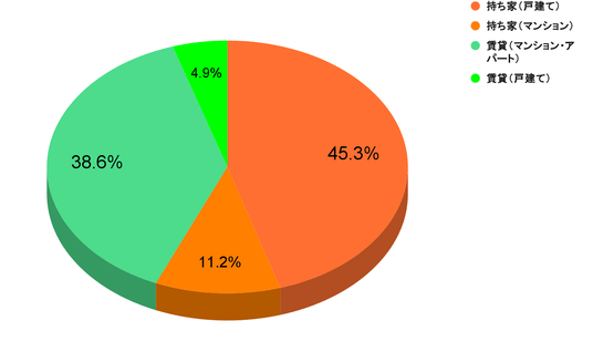 弊社アンドリフォームが行った住宅アンケートでは、857名の回答者のうち持ち家派が全体の約56.5% を占め、依然として多数派であることがわかりました。内訳を見ると、「持ち家(戸建て)」が388名(45.3%) と最も多く、次いで 「賃貸(マンション・アパート)」が331名(38.6%) という結果 になりました。さらに、「持ち家(マンション)」は96名(11.2%)、「賃貸(戸建て)」は42名(4.9%) と続きます。