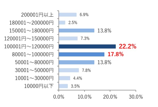 「高すぎる」と感じる新品スマホの価格は「10万円以上~12万円以下(22.2%)」が最も多く、次いで「8万円以上~10万円以下(17.8%)」でした。8万円以上をボーダーラインに“高すぎる”と感じる人が7割以上を占めており、8万円以下を“高すぎる”と回答した人の合計は29.5%と約3割にとどまりました。