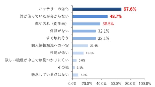 一方で、中古スマホが選択肢に入らない理由としては、「バッテリーの劣化(67.6%)」や「誰が使っていたかわからない(48.7%)」、「傷や汚れ(38.5%)」などが懸念点に挙げられました。