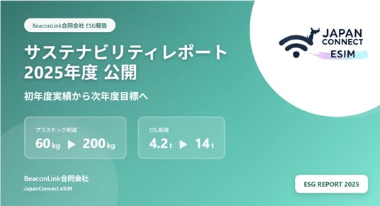 海外旅行者向けeSIMサービス「JapanConnect eSIM(https://japanconnect-esim.store/)」を提供するBeaconLink合同会社(本社:東京都日野市、代表:阿部宏貴)は、このたび「JapanConnect eSIM サステナビリティレポート 2025年度(BeaconLink合同会社 ESG報告)」を発行しました。本レポートでは、2024年8月~2025年8月の1年間における環境・社会・ガバナンス(ESG)の取り組みと実績をまとめています。
