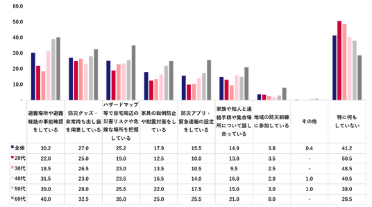 実施している防災対策では、「特に何もしていない」が全体の41.2%で最多だった。対策している内容では「避難場所や避難経路の事前確認」(30.2%)、「防災グッズ・非常持ち出し袋の準備」(27.0%)、「ハザードマップによる周辺リスクの把握」(25.2%)と続いた。年代別では、年代が下がるほど防災対策の実施率が低くなり、60代では「特に何もしていない」が28.5%だったのに対し、20代では50.5%だった。