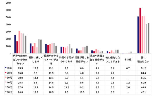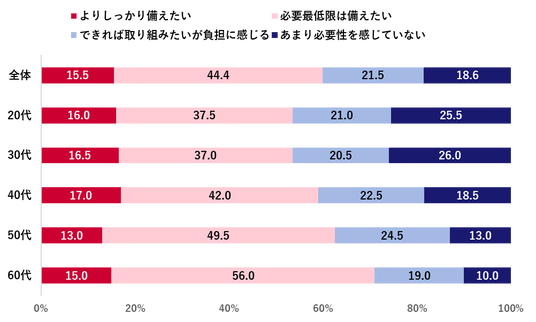 年代別に見ると、60代では「必要最低限は備えたい」が56.0%と過半数を占め、「よりしっかり備えたい」(15.0%)を合わせると、71.0%となった。一方、20代・30代は「必要最低限は備えたい」「よりしっかり備えたい」を合わせて、それぞれ53.5%に留まった。また「あまり必要性を感じていない」が他の年代よりも高く約25%となり、防災意識の低さがうかがえた。