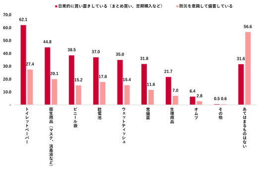 日用品については、日常的に買い置きしている物では「トイレットペーパー」(62.1%)、「衛生用品(マスク・消毒液など)」(44.8%)、「ビニール袋」(38.5%)などが上位となった。一方で、防災を意識して備蓄している物については、「あてはまるものはない」が56.6%と過半数に上り、「トイレットペーパー」は27.4%にとどまった。