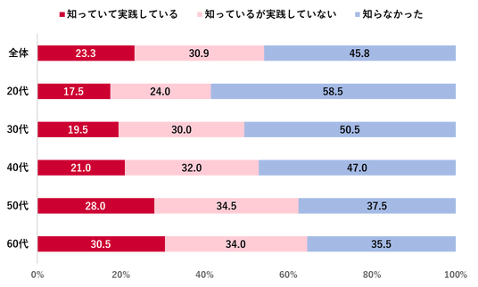また、日常生活の中で食料品を消費しながら備蓄する「ローリングストック法」については、「知らなかった」が45.8%で最多、「知っているが実践していない」(30.9%)、「知っていて実践している」(23.3%)という結果となった。
