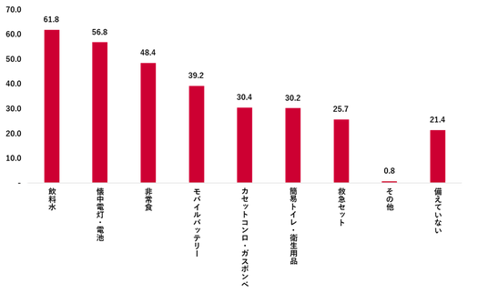 現在家庭に備えている防災関連品の内訳では、「飲料水」(61.8%)が最多で、次いで「懐中電灯・電池」(56.8%)、「非常食」(48.4%)だった。また「モバイルバッテリー」が39.2%で4位となった。停電や断水といったライフラインの停止を想定した基本的な備えをしている人が多い。