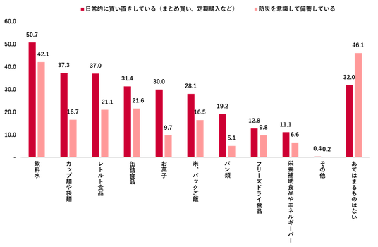 日常的に買い置きしている食料品では、「飲料水」(50.7%)が最も多く、「カップ麺や袋麺」(37.3%)、「レトルト食品」(37.0%)が続いた。これに対し、防災を意識して備蓄している食料品については、「あてはまるものはない」が46.1%と最多。次いで「飲料水」(42.1%)、「缶詰食品」「レトルト食品」はいずれも約20%にとどまった。