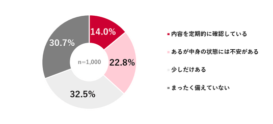 自宅に防災備蓄品があるかについては、「少しだけある」が32.5%と最も多く、次いで「まったく備えていない」が30.7%、「あるが中身の状態には不安がある」が22.8%、「内容を定期的に確認している」が14.0%だった。