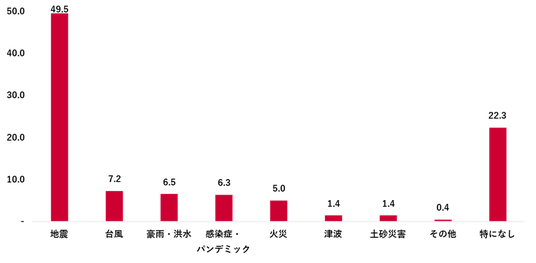 全国の生活者に、最も意識している災害を尋ねたところ、「地震」が49.5%で最多となった。2位の「台風」は7.2%となり、大きな差があった。一方で「特になし」と回答した人が22.3%になった。