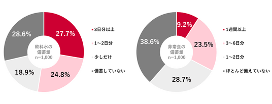 飲料水の備蓄量については、「備蓄していない」が28.6%を占めた一方で、「3日分以上」が27.7%、「1~2日分」が24.8%、「少しだけ」が18.9%だった。非常食については、「ほとんど備えていない」が38.6%と最多。次いで「1~2日分」(28.7%)、「3~6日分」(23.5%)、「1週間以上」(9.2%)となった。備蓄量が増えるにつれて、備えていると回答した人の割合が低下した。