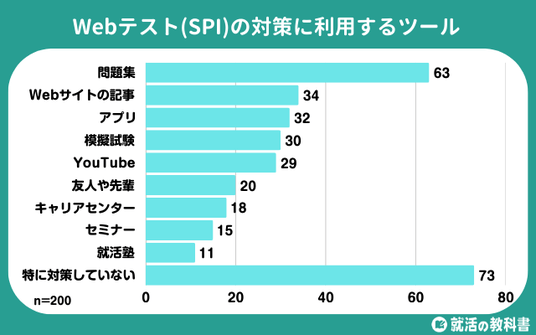 Webテスト(SPI)の対策に利用するツールは「問題集」(63人)が最も多くなりました。