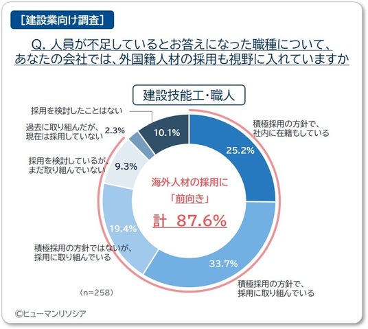 また「技能実習」の在留資格での就業者が約11万人に上り、今後も拡大が見込まれる建設技能工・職人においては(※1)、58.9%が海外人材を積極採用しており、87.6%が海外人材採用に「前向き」と回答しています。