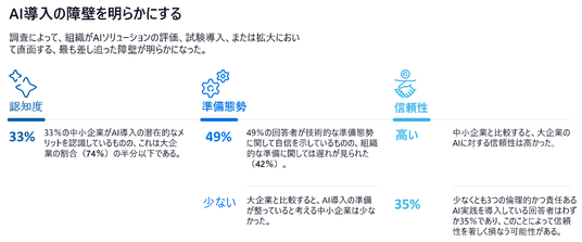 - 中小企業での認識の遅れ - 大企業では74%がAIのメリットを強く認識している一方で中小企業では33%にとどまる。