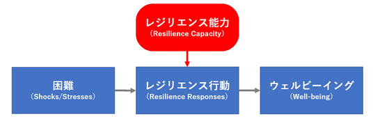 まず、レジリエンス能力とは、ウェルビーイング(Well-being)の維持・向上のため、生活者が日常生活で直面するさまざまな困難(Shocks/Stresses)を乗り越えるために選択する行動(Response)の背景にある能力(Capacity)です(以下図参照)。