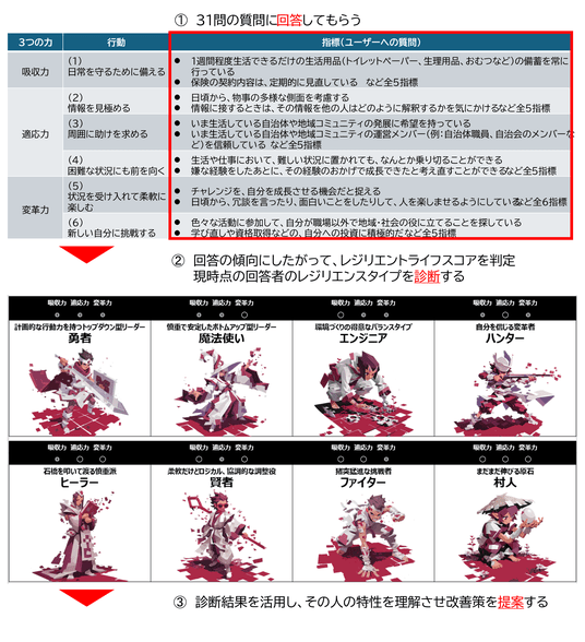 31の質問に回答することで、「吸収力」「適応力」「変革力」のバランスが測定され、8つのレジリエンスタイプのいずれかに診断されます。現時点での自身のレジリエンスタイプを把握することで、自然災害などのさまざまな困難に対する振る舞いを想像したり、すぐに取り組むことの出来るアクションを知ることが出来たり、今後開発予定のサービスを通じて専門家からのアドバイスを受けることが出来ます。※注2