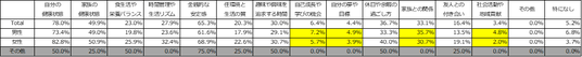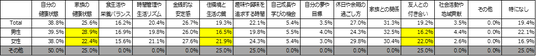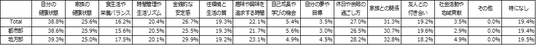性別でみると、男女で上位の順位に大きな差はみられないものの、多くの項目で女性の数値の方が高いなか、男性の方が高かった項目は「家族との関係」「社会活動や地域貢献」「自己成長や学びの機会」「自分の夢や目標」だった。