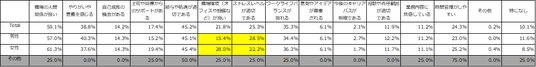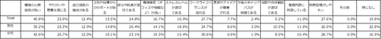 性別でみると、男女ともに1位から4位までは同様の結果だったが、5位に男性では「ストレスレベルが適切である」、女性では「職場環境が良い」が入っており、この2項目については男女の数値の差も大きかった。