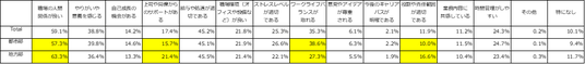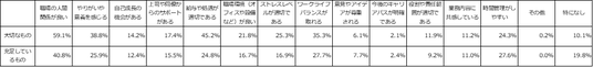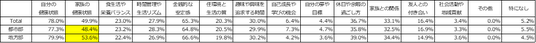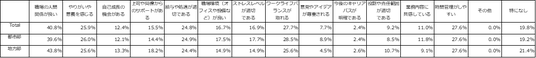 地域別では、都市部・地方部ともに1位から4位までの順位は変わらないが、4位の「ワークライフバランス」では都市部の方が11.3%pt高く、地域間で大きな差がついた。また、地方部に比べると都市部では「ワークライフバランスが取れる」が高く、都市部に比べると地方部では「職場の人間関係」「上司・同僚からのサポートがある」「役割・責任範囲が適切である」が高い結果となった。