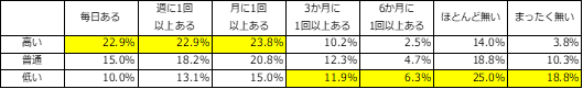 ■「仕事の満足度・充実度」(Q1)と「職場の人と仕事の内容以外で時間を共有する機会」(Q9)の関係を調べると、「仕事の満足度・充実度」が「高い」と回答した人のうち「月に1回以上ある」と回答した人は44.0%にのぼり、「ほとんど無い」「全く無い」と回答した人は、27.8%だった。一方、満足度が「低い」と回答した人では、「ほとんど無い」「まったく無い」と回答した人は58.7%にのぼり、顕著な差がみられた。