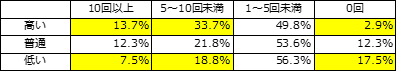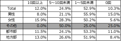 性別でみると、「5回以上」と回答した割合が女性では44.2%だったのに対し、男性は29.1%に留まり、大きな差がみられた。地域別では顕著な差はみられなかった。