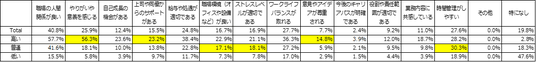 一方で、「やりがいや意義を感じる」「上司や同僚からのサポートがある」「意見やアイデアが尊重される」の3項目については、仕事の満足度・充実度が「普通」と回答した人と、「高い」と回答した人の間で割合が大きく異なった。