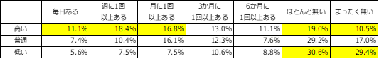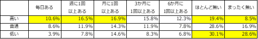 ■「生活の満足度・充実度」(Q4)と「職場の人と仕事の内容以外で時間を共有する機会」(Q9)の関係を調べると、「生活の満足度・充実度」が「高い」と回答した人のうち「月に1回以上ある」と回答した人は46.3%にのぼり、「ほとんど無い」「全く無い」と回答した人は、29.5%だった。一方、満足度が「低い」と回答した人では、「ほとんど無い」「まったく無い」と回答した人は60.0%にのぼり、「仕事の満足度・充実度」と比較したとき(Q9-1)と同様に顕著な差がみられた。